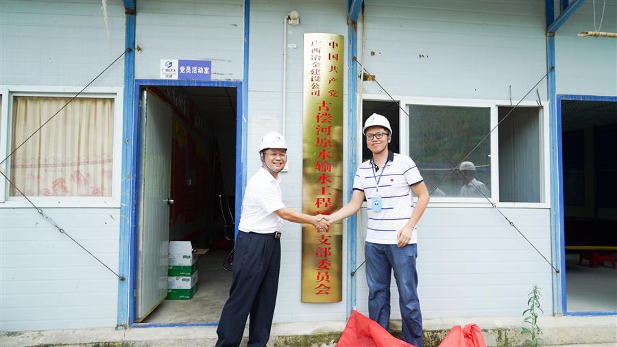 公司黨委書(shū)記、董事長(zhǎng)覃振華(左)為古償河項(xiàng)目黨支部揭牌