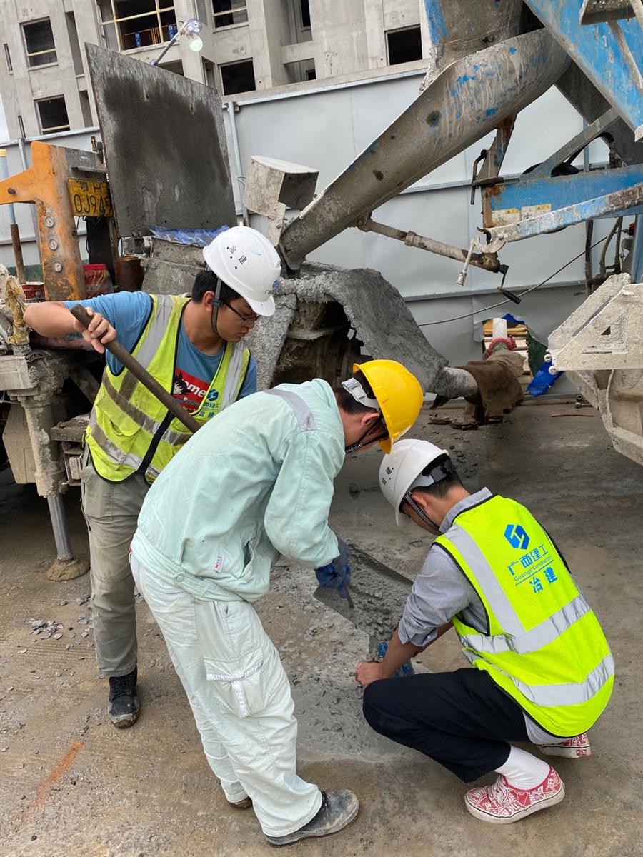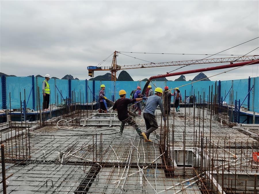 馬達(dá)聲、電鉆聲轟鳴,混凝土攪拌車、混凝土泵車、材料運輸板車、土方綠皮車來往穿梭,綁扎鋼筋、混凝土塌落度試驗、澆筑混凝土、升爬架前驗收等工作有條不紊進(jìn)行,這是第四分公司融創(chuàng)江南林語項目的趕工現(xiàn)場。