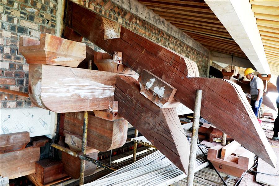 連日來,在該項目湖心閣斗栱安裝現(xiàn)場,每天有20多名經(jīng)驗豐富的木工師傅在認(rèn)真進(jìn)行斗栱安裝作業(yè)。為保證項目質(zhì)量,解決項目斗栱安裝難題,加快安裝速度,項目部結(jié)合實際,通過多次試驗和優(yōu)化設(shè)計,確保柱子能承受斗栱重量,采用正裝方式進(jìn)行安裝,保證了安裝速度和安裝質(zhì)量。面對項目選用的木制斗栱材料密度大、重量重、安裝作業(yè)工作面窄等困難,木工師傅結(jié)合自身多年的木工經(jīng)驗,克服現(xiàn)場施工遇到的困難,相互配合,目前已完成斗栱安裝工作量的三分之一。
