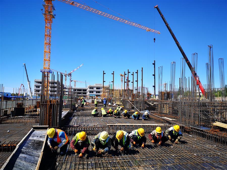 目前,項目正在進行主體施工,施工現(xiàn)場正緊張有序地進行著模板安裝、鋼筋綁扎、水電管線預埋、鋼結(jié)構(gòu)吊裝等工作。