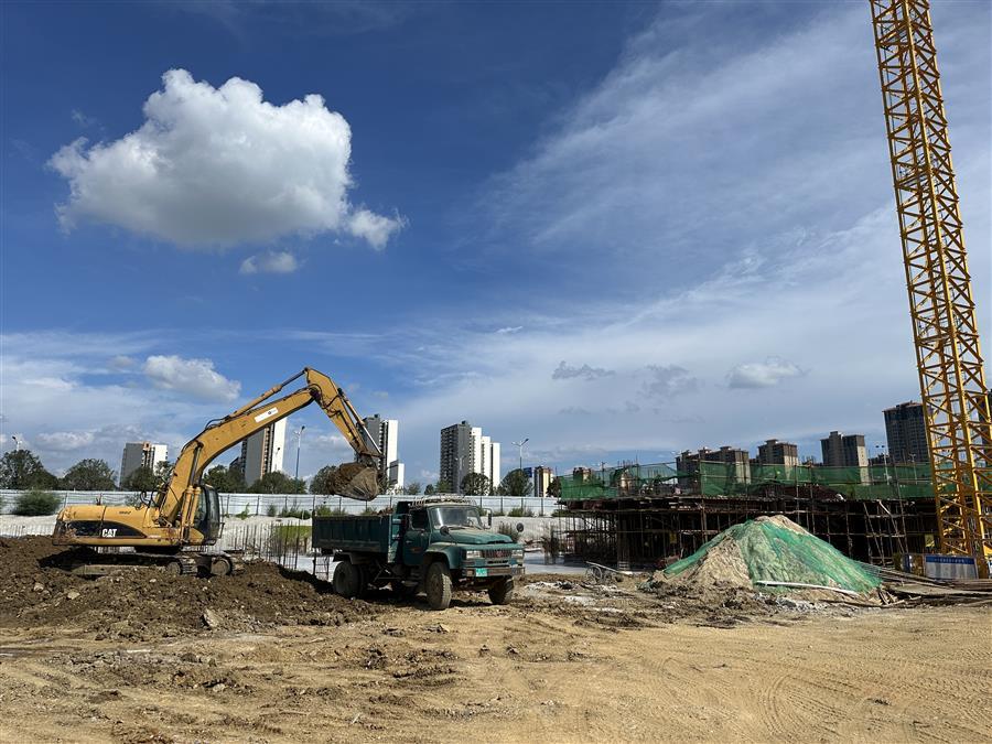 在農投思賢幸福加項目,技術人員測繪、工人在綁扎鋼筋各作業(yè)面工作人員緊張忙碌地開展工作;施工機械運轉不停、運輸車輛來回穿梭,一派繁忙景象。
