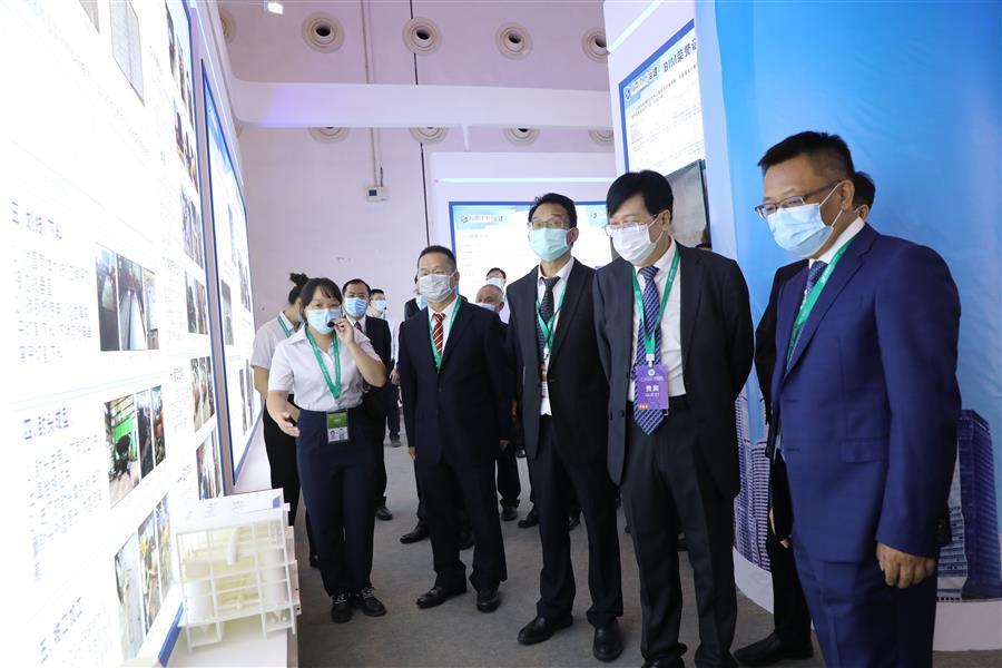 自治區(qū)住房和城鄉(xiāng)建設廳副廳長葉云(左二)、潘國雄(左三)一行到冶建公司展區(qū)參觀