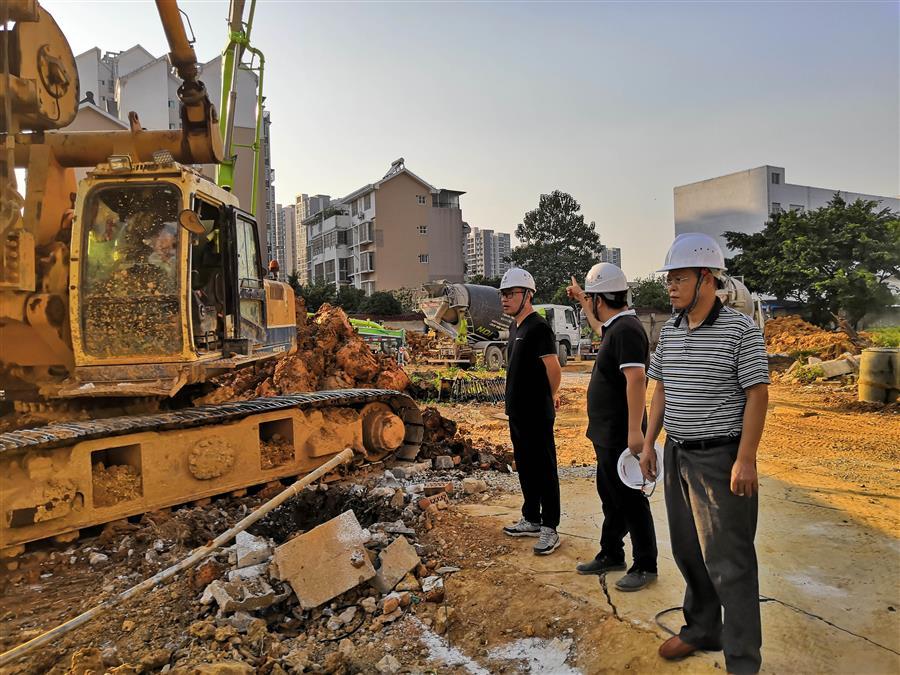 10月5日上午,桂東分公司經(jīng)理謝勇、黨支部書記黃桂軍來到柳州市防汛抗旱物資儲備倉庫工程項目現(xiàn)場慰問看望節(jié)假日仍堅守崗位的一線員工。該項目施工現(xiàn)場地質(zhì)條件復(fù)雜,容易塌孔且地下層部分為巖石層結(jié)構(gòu),施工難度大。為確保在甲方要求的工期內(nèi)完成施工,工人們節(jié)假日仍加班加點搶工期。他們腳踏黃土,頭頂著炎炎烈日,揮灑著蒸騰的汗水,以實際行動為集團(tuán)公司早日躋身世界500強(qiáng)貢獻(xiàn)力量!