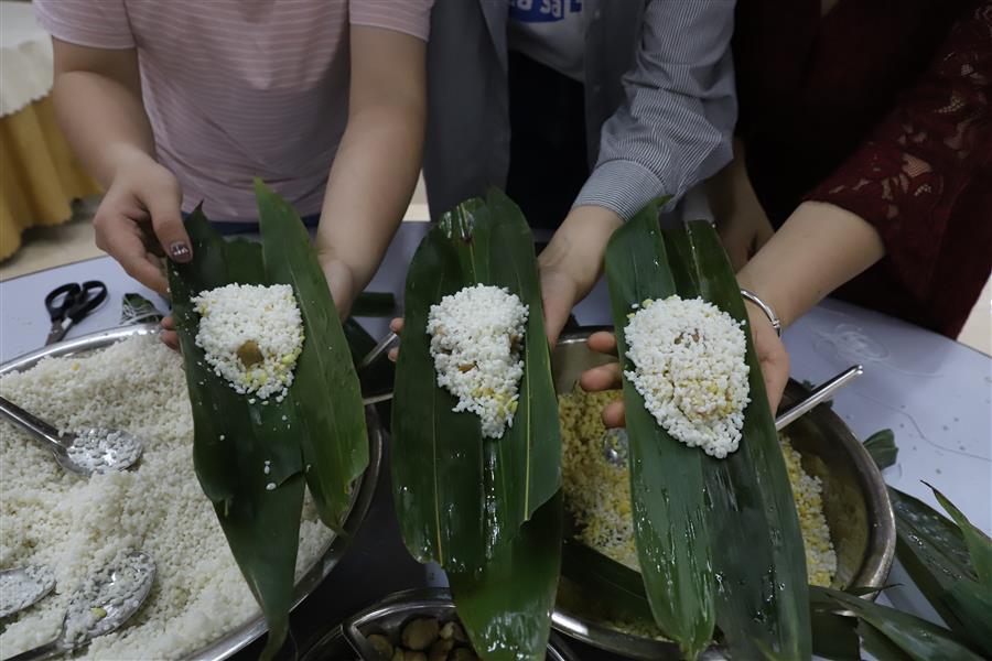 經(jīng)過簡單的現(xiàn)場教學(xué)后,大家領(lǐng)取材料,分組配合,踴躍參與包粽子比賽,只見大家捋粽葉、放餡、封口、扎捆,動作一氣呵成,不一會兒,一只只各式各樣的粽子就在大家手中成型。