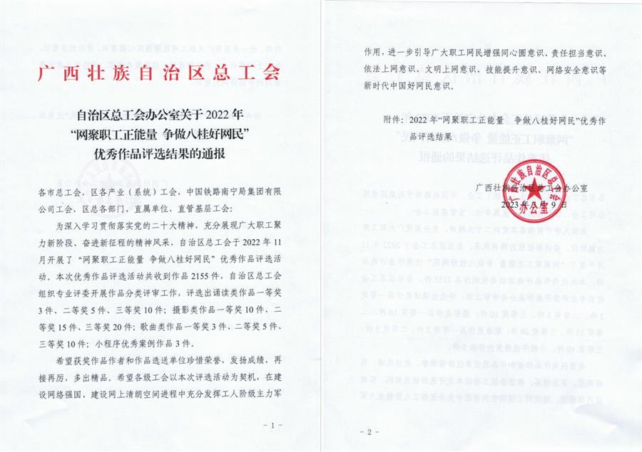 近日,自治區(qū)總工會公布了2022年“網(wǎng)聚職工正能  爭做八桂好網(wǎng)民”優(yōu)秀作品評選結(jié)果,公司職工攝影作品《焊花飛濺鑄匠心》榮獲一等獎(jiǎng),《組圖:爬“天梯”去植綠》榮獲三等獎(jiǎng)。