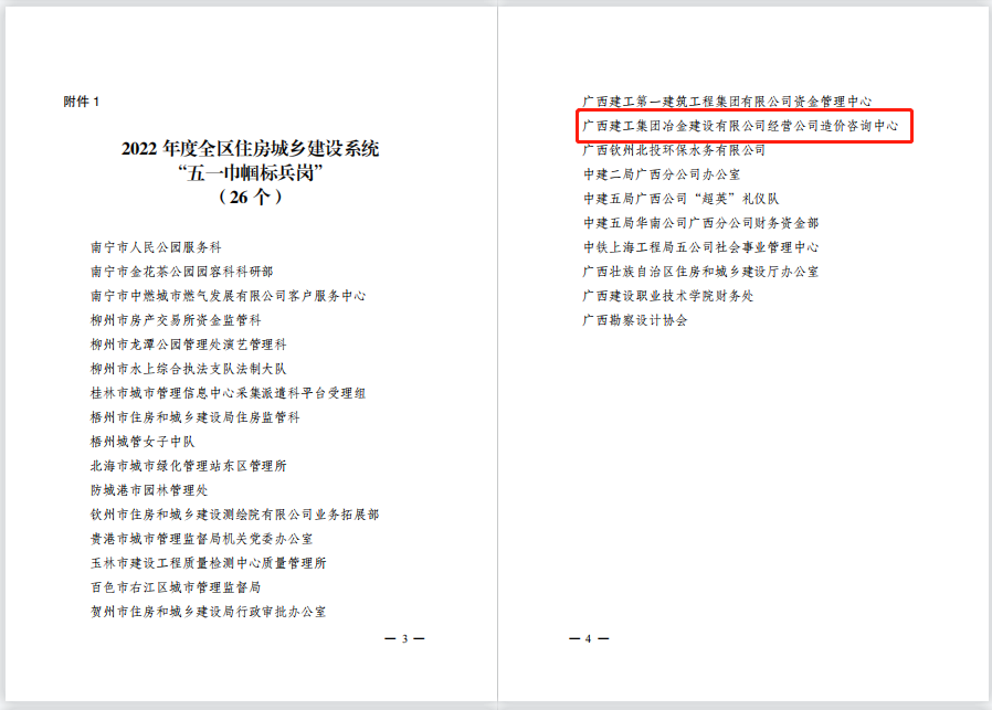近日,廣西建設(shè)工會工作委員會下發(fā)了《關(guān)于命名2022年度全區(qū)住房城鄉(xiāng)建設(shè)系統(tǒng)“五一巾幗標兵崗”“五一巾幗標兵”的決定》,冶建經(jīng)營公司造價咨詢中心榮獲“五一巾幗標兵崗”稱號。